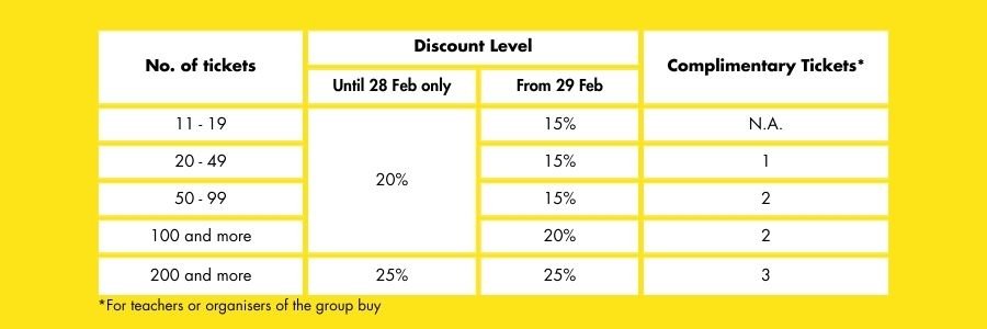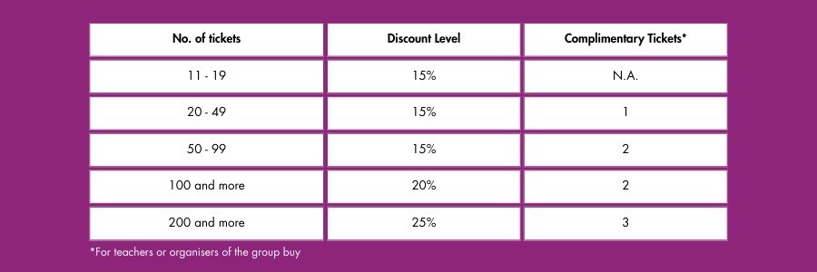 Note: In the event of dynamic pricing (which applies to this production), we will honor original ticket prices for group bookings with a min. booking of 20 tickets for school groups, and 50 tickets for corporate groups.